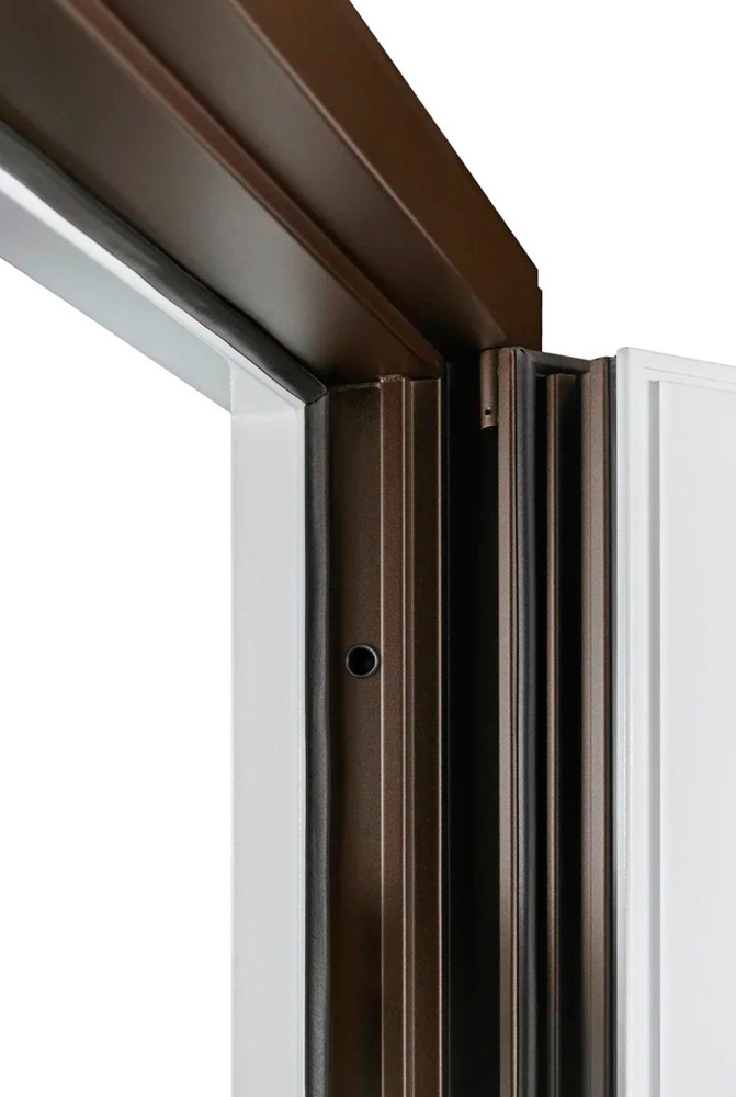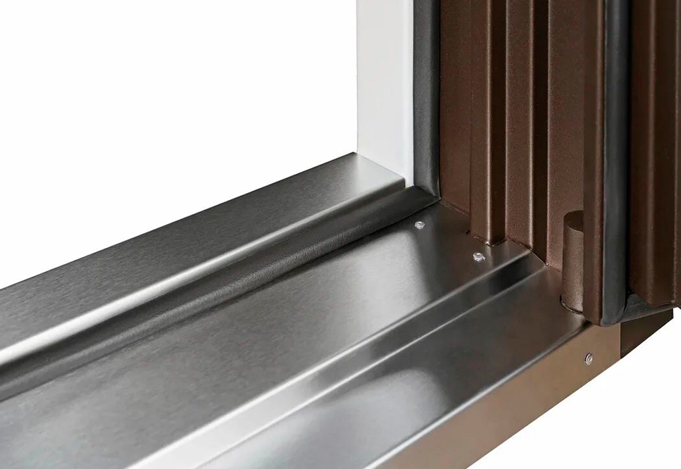толщина 110 мм. терморазрыв обеспечивается наличием изоляционного слоя с низкой теплопроводностью, Двухсторонний окрас; внешний цвет темно-коричневый Муар с разноцветными блесками + цинкогрунтовочный слой, внутренний цвет шагрень белая + цинкогрунтовочный слой порошково-полимерное покрытие;