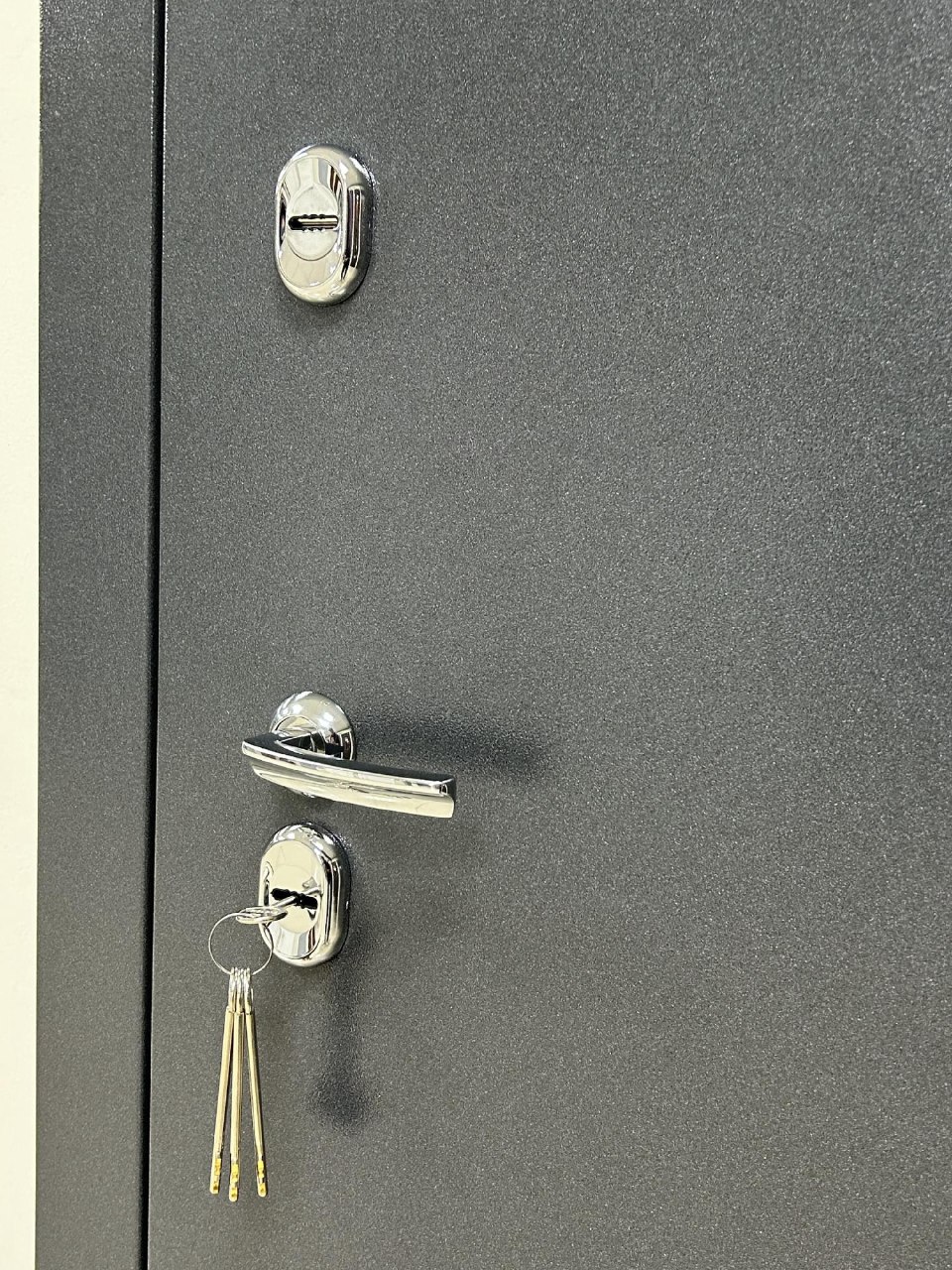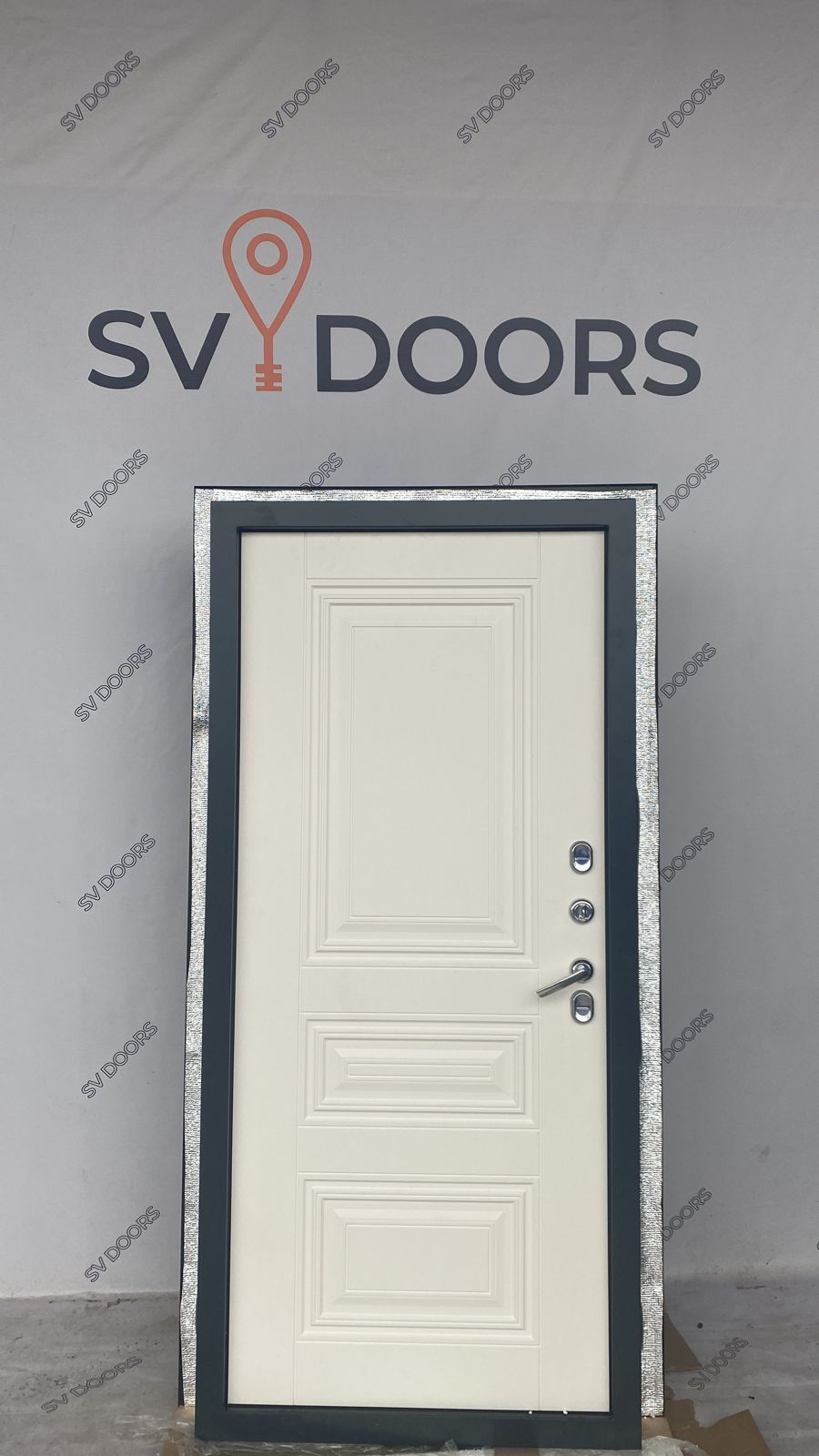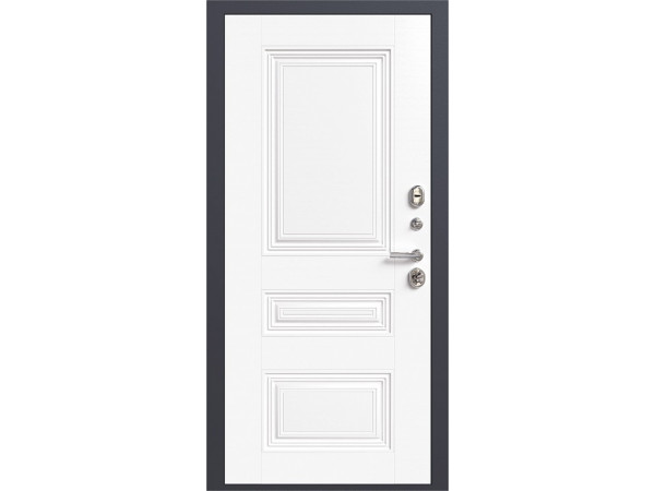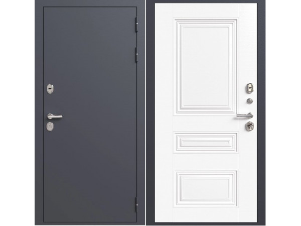 ВХОДНАЯ ДВЕРЬ БАСТИОН ТЕРМО / букле серое / ясень белый. Толщина полотна: 105 мм. Внешнее покрытие: Букле серое атмосферостойкий AkzoNobel. Внутреннее покрытие: МДФ-панель 12 мм, Ясень белый, Шале моренный. Утеплитель: минеральная плита + пенополистирол + фольгоизолон. Терморазрыв: усиленный, двухкамерный 25 мм. Уплотнитель: 3 контура уплотнения. Петли: 3 шт, внешние, открывание 180. Замки: 2 сувальдных Гардиан (4 класс взломостойкости). Противосъемные ригели: 3 шт, 12 мм. Короб: открытый. Ручка: раздельная, цвет - хром. Ночная задвижка: есть. Эксцентрик: есть. Стандартный размер по коробу: 860/960*2050 мм.