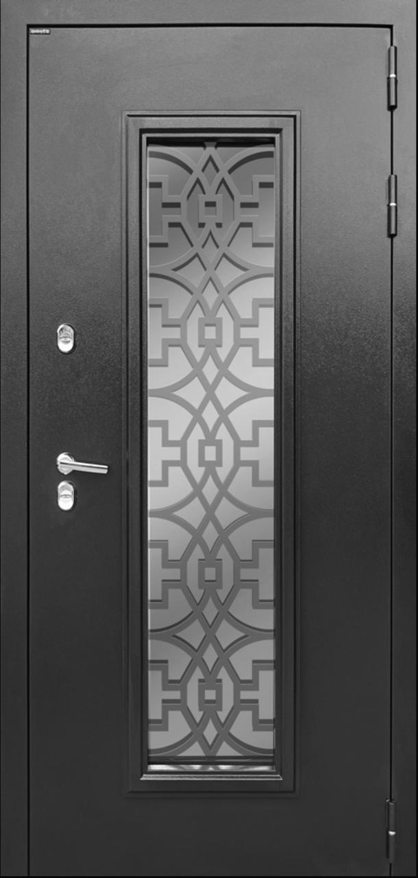 Отделка снаружи: покрытие цинкогрунт + антик серебро, стеклопакет зеркальный (рефлектив серебро) 4-х камерный, внутри стеклопакета декоративный элемент из листа металла 3мм,покрытие чёрный муар