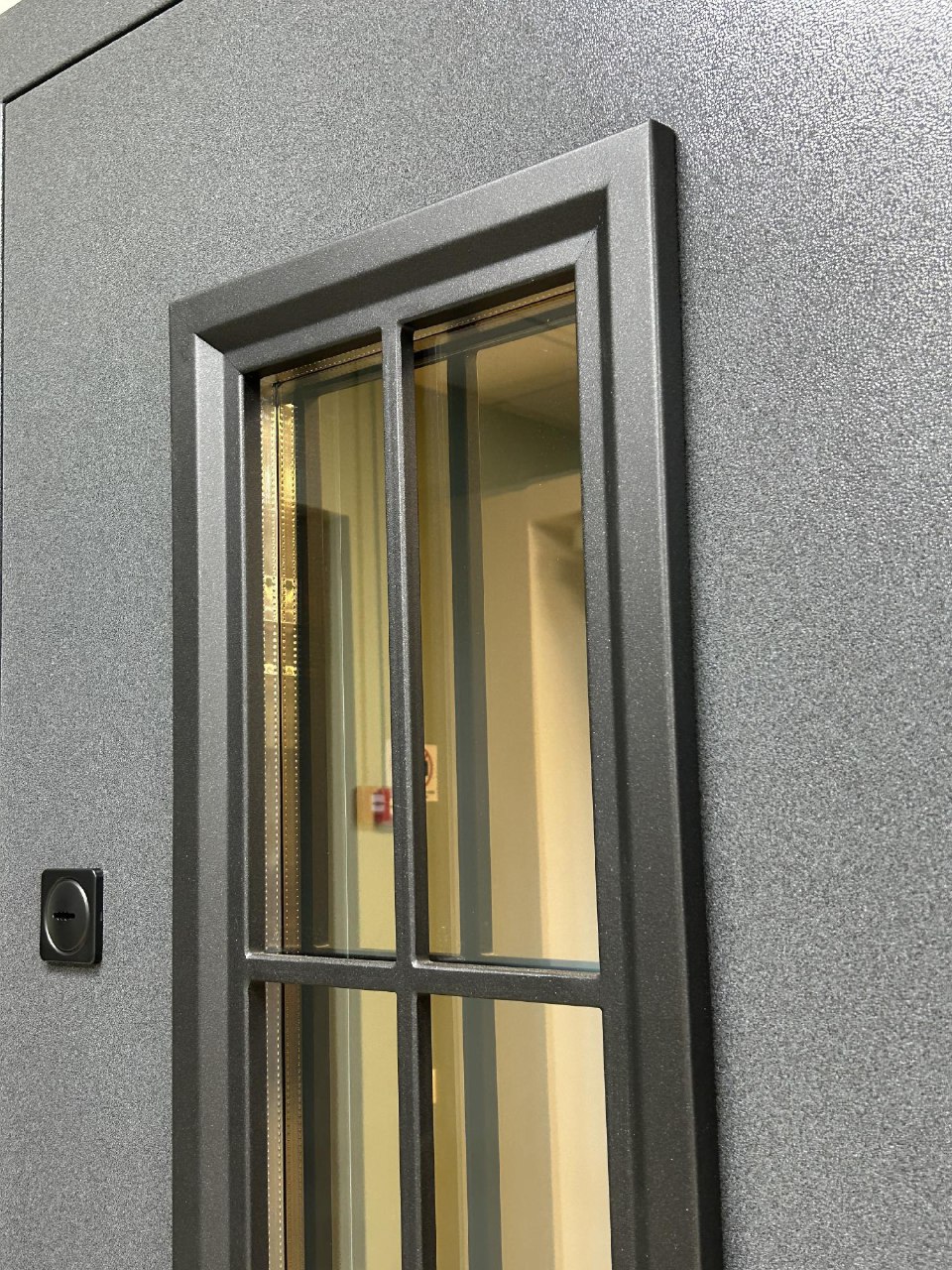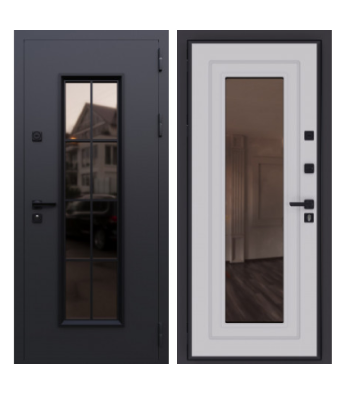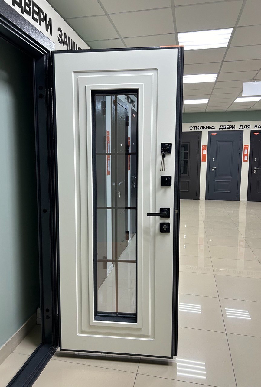 Бристоль Толщина полотна: 100 мм Внешнее покрытие: Букле серый, атмосферостойкий AkzoNobel Стеклопакет: тонированный бронза, кованные элементы Внутреннее покрытие: МДФ-панель 10 мм, Эмалит белый Утеплитель: минеральная плита Уплотнитель: 3 контура уплотнения Замки: цилиндровый и сувальный Гардиан (4 класс взомостойкости) Противосъемные ригели: 3 шт, 12 мм Петли: 3 шт, внешние, открывание 180 Короб: закрытый, утепленный Ручка: раздельная, цвет - Черный Глазок: отсутствует Эксцентрик: есть Стандартный размер по коробу: 860/960*2050