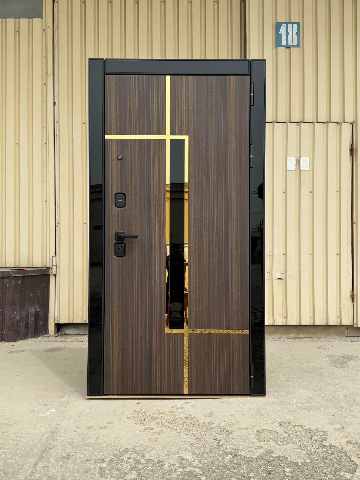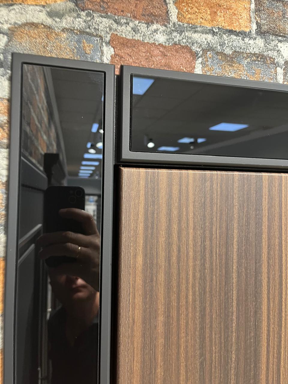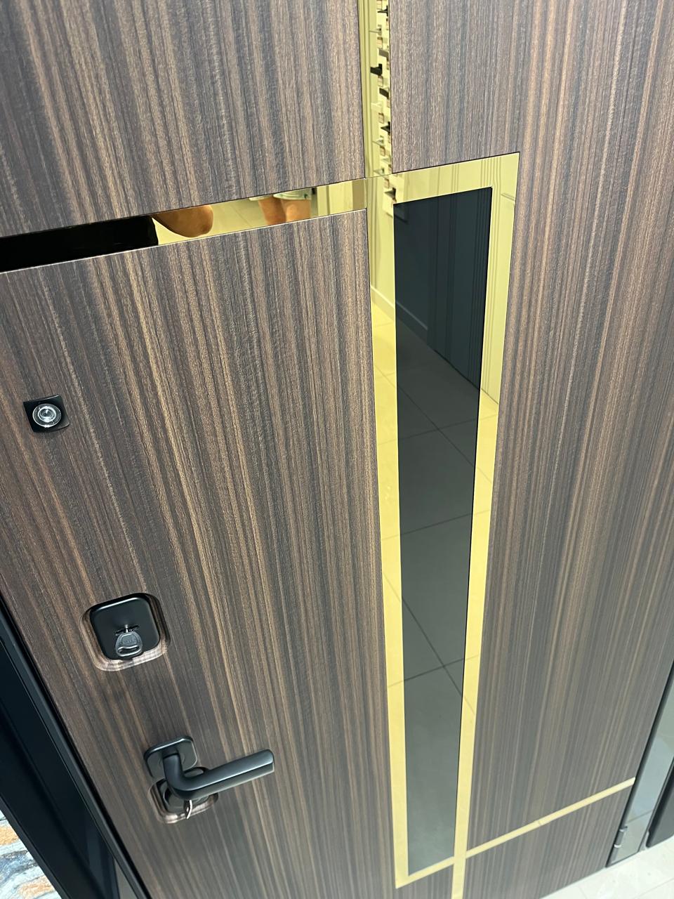 Отделка снаружи: панель МДФ 16мм, пленка ЭВКАЛИПТ АФРИКАНСКИЙ, нержавейка золото. Вставка - стекло черное.