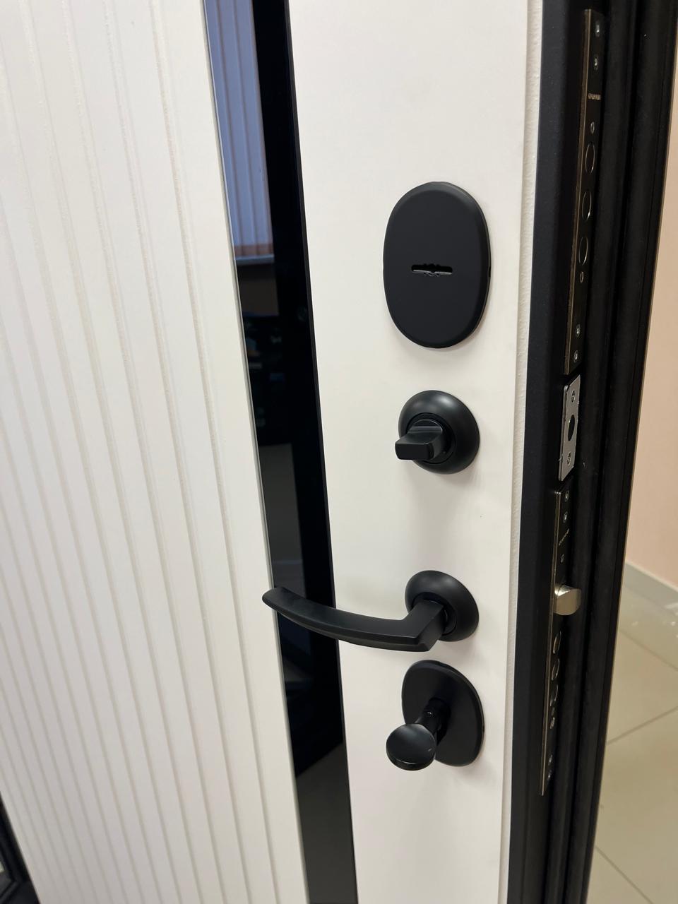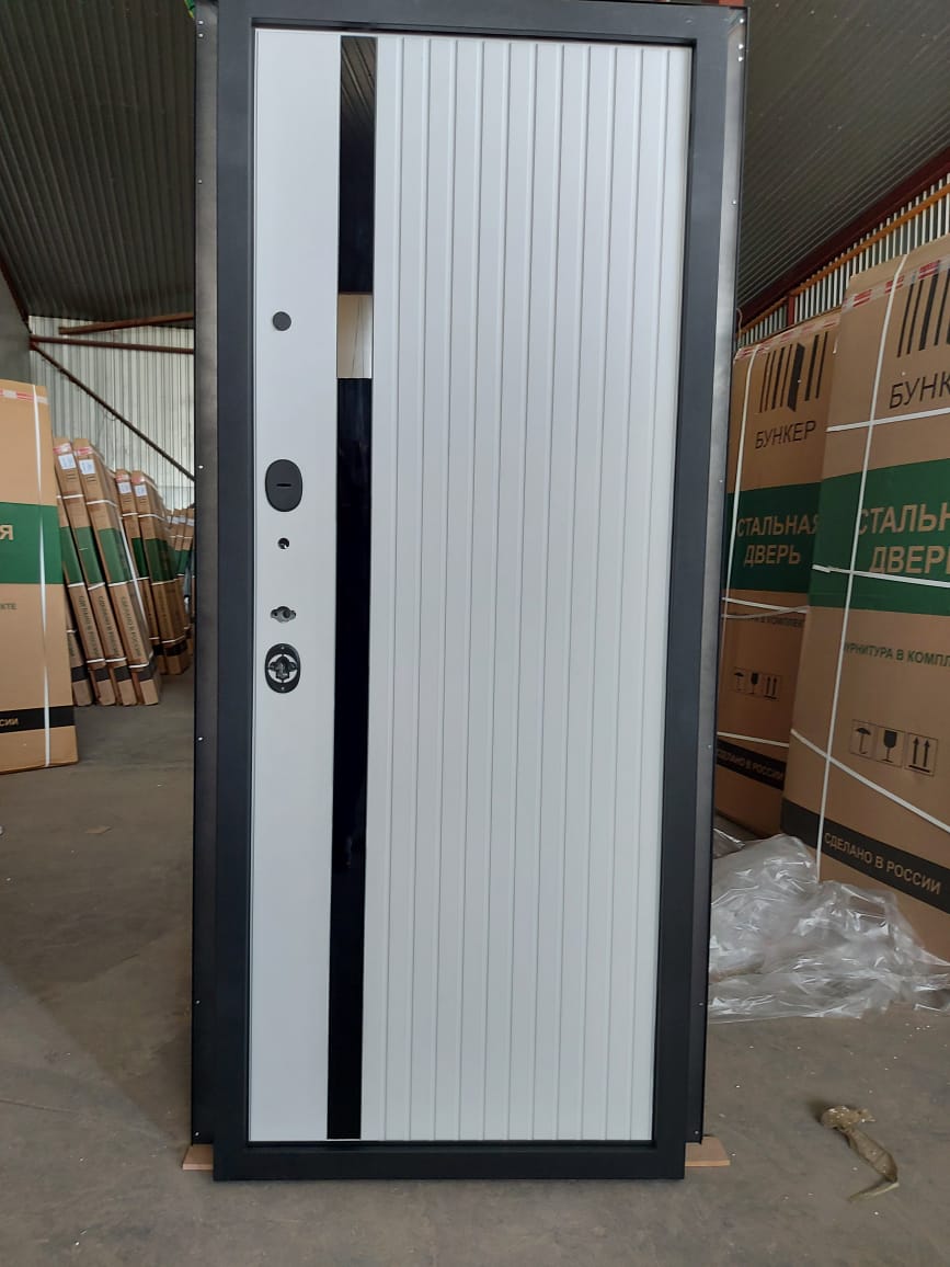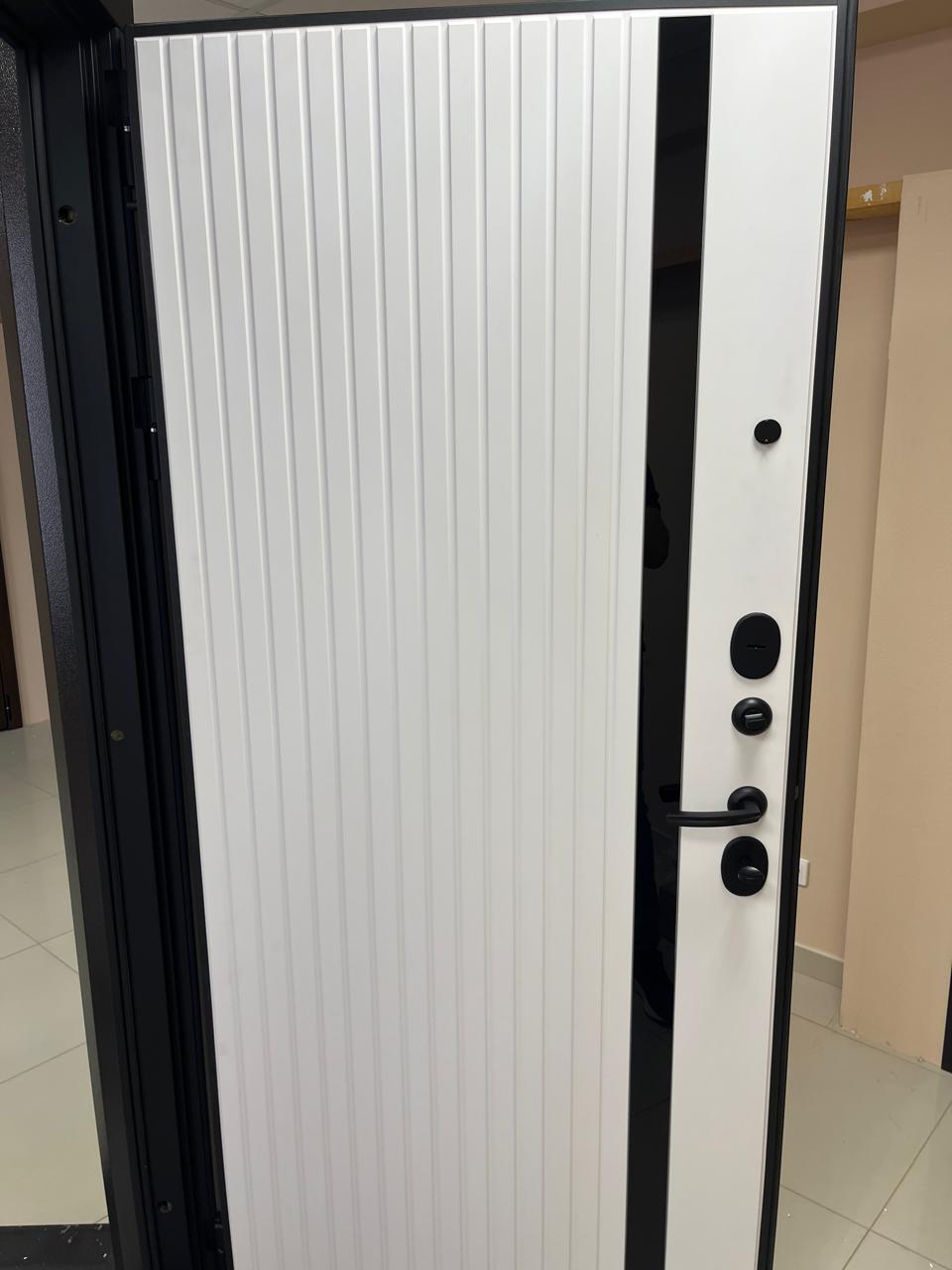 Металлическая входная дверь Юта Дуб белый Отделка снаружи: панель МДФ 10мм, пленка дуб темный, патина черная по фрезеровке Отделка внутри: панель МДФ 10 мм, пленка (не софт) цвет белый, вставка- черная лакобель Толщина двери 104 мм. Дверь имеет закрытый утепленный короб, эксцентрик Наполнитель: Базальтовая плита Двери в наличии на складе с правым и левым открыванием. Фурнитура хром, независимая ночная задвижка Дверь имеет 3 контура уплотнения, сложный притвор На двери установлены замки Гардиан