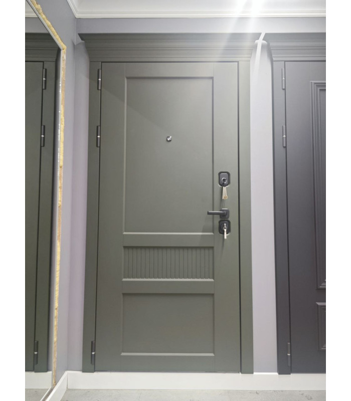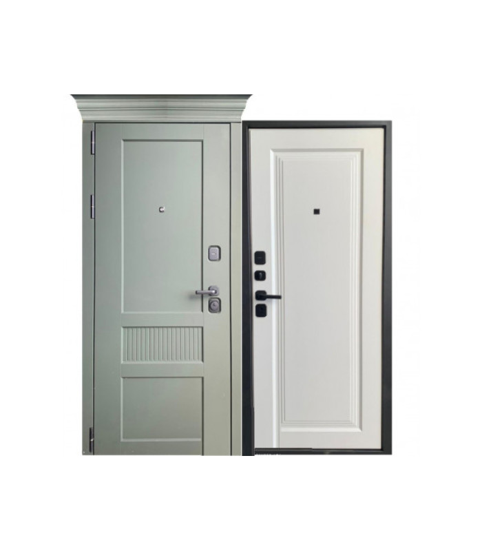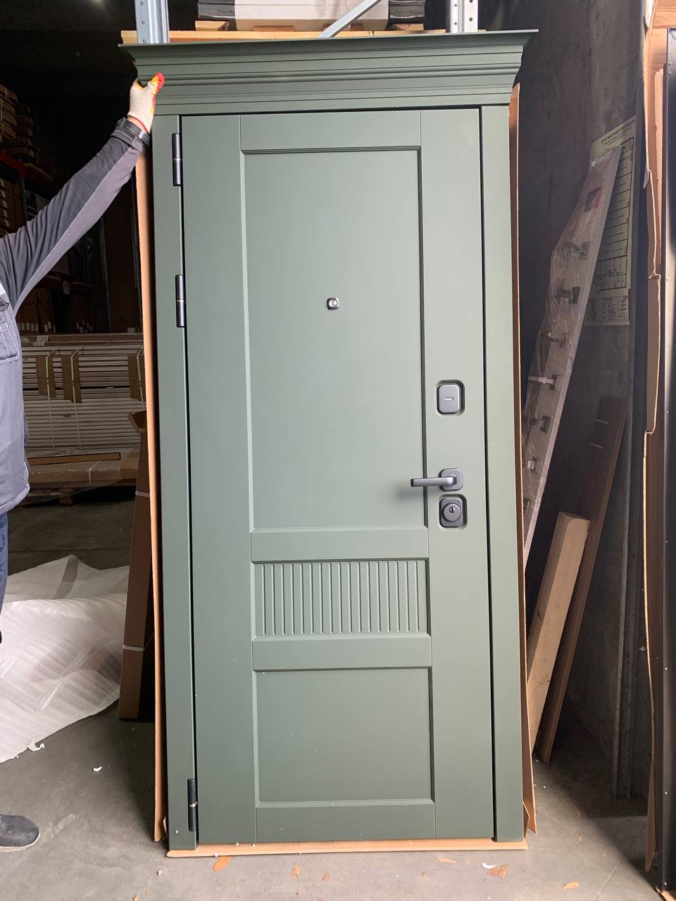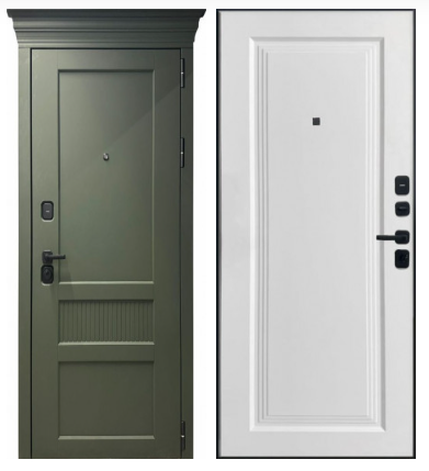 Входная дверь ГРАЦИЯ С КАПИТЕЛЬЮ Отделка снаружи: МДФ 16 мм, Д-619, Олива Софт Отделка внутри: МДФ 16 мм, ФЛ-776, Белый ZB 00 850-2 Толщина полотна 90 мм. Дверь имеет закрытый утепленный короб, эксцентрик Наполнитель: Базальтовая плита Дверь имеет 3 контура уплотнения, 3 петли на опорных подшипниках обеспечивают мягкое открывание. На двери установлены замки Гардиан Г3011, Г300