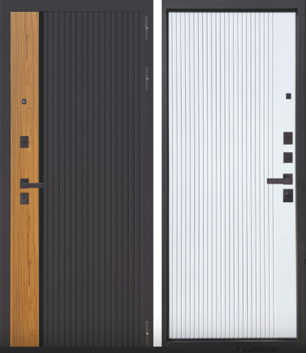 Размеры: 860/960*2050мм Толщина полотна: 104мм Глубина короба: 115мм Внешняя отделка: МДФ-панель 10мм, цвет "Орех каньон" + "Сатин чёрный" + вертикальная вставка из черного стекла Внутреннее покрытие: фрезерованная МДФ-панель 10мм, цвет "Эмалит белый" Наполнение: ППС Уплотнитель: 3 контура уплотнения Петли: 3 шт Основной замок: цилиндровый Карат/Монарх/Бордер Дополнительный замок: сувальдный Карат/Монарх/Бордер Независимая ночная задвижка, глазок, броненакладка на основном замке