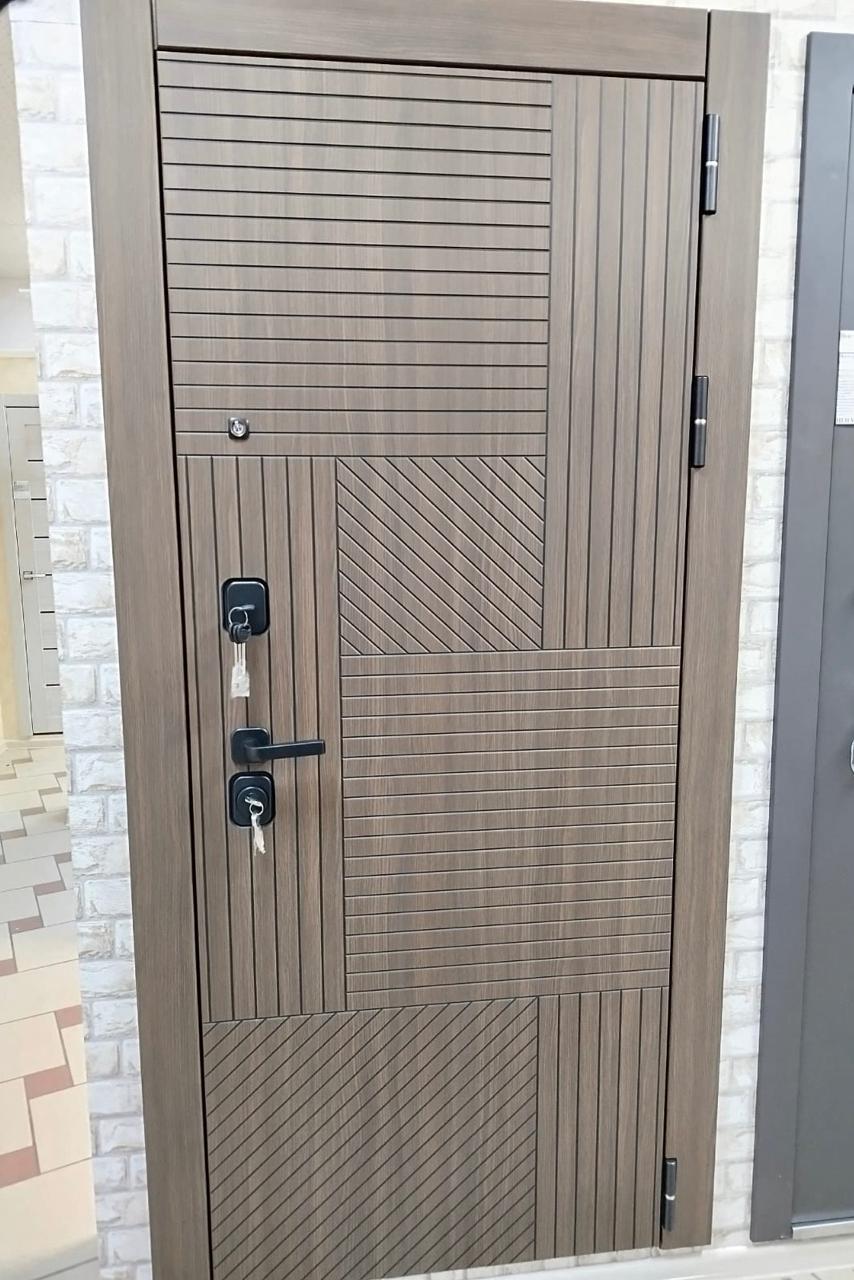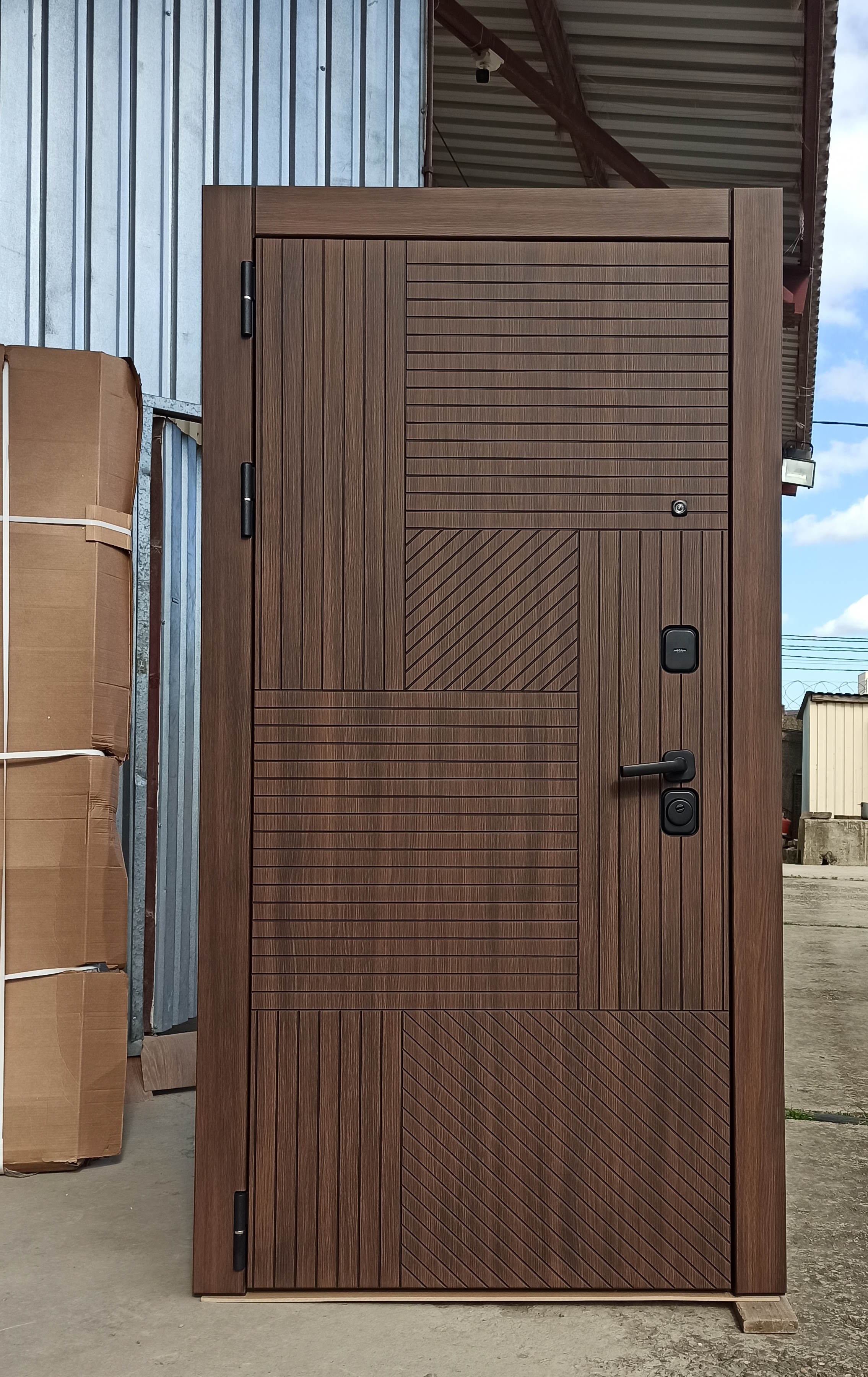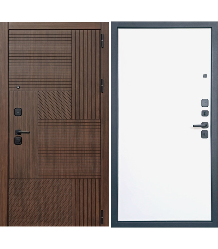 Металлическая входная дверь Браун Отделка снаружи: панель МДФ 10мм, пленка орех, патина черная Отделка внутри: панель МДФ 10 мм, пленка орех, патина черная Толщина двери 110 мм. Дверь имеет закрытый утепленный короб, эксцентрик Наполнитель: Базальтовая плита Двери в наличии на складе с правым и левым открыванием. Фурнитура хром, независимая ночная задвижка Дверь имеет 3 контура уплотнения На двери установлены замки Гардиан