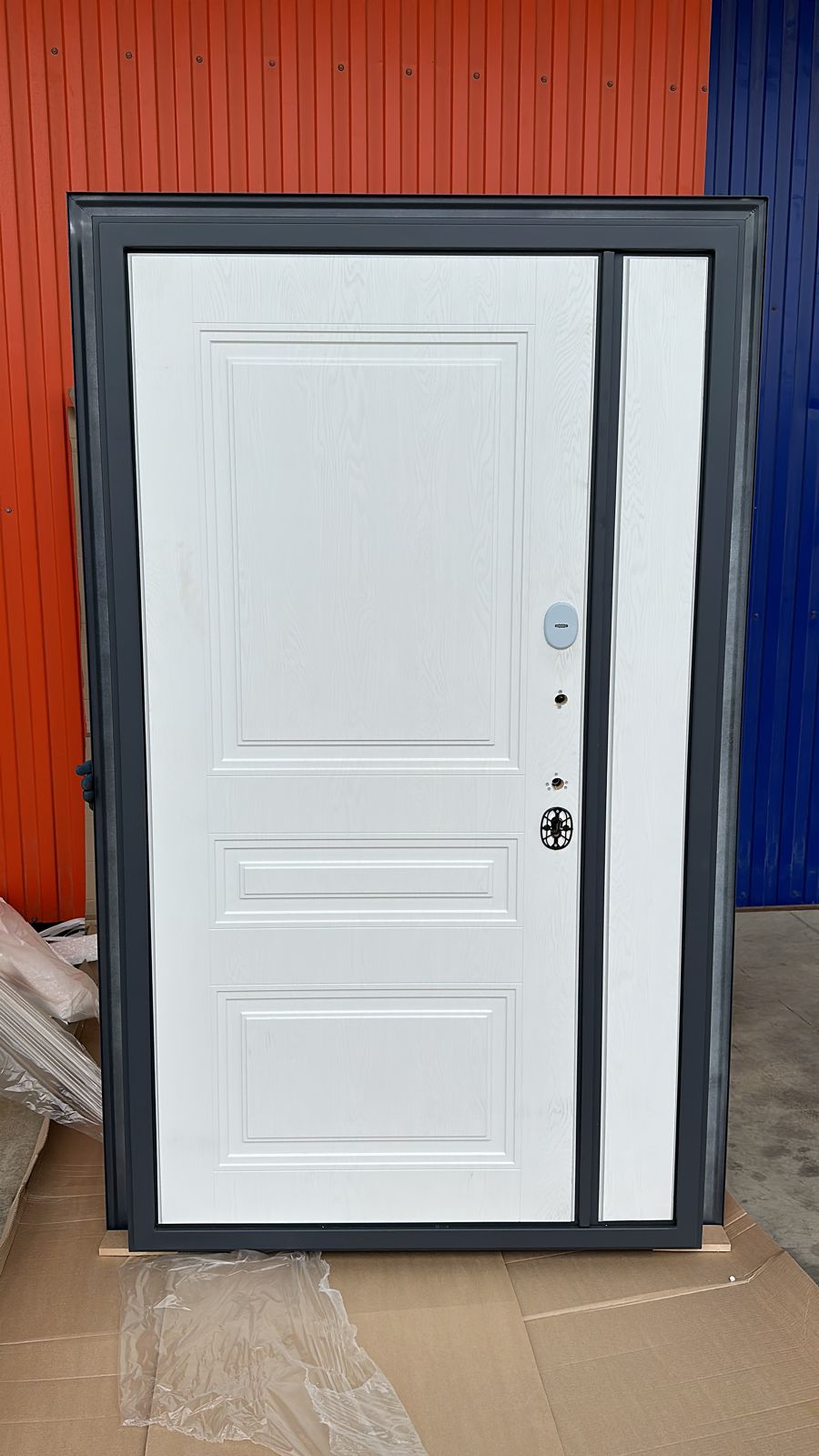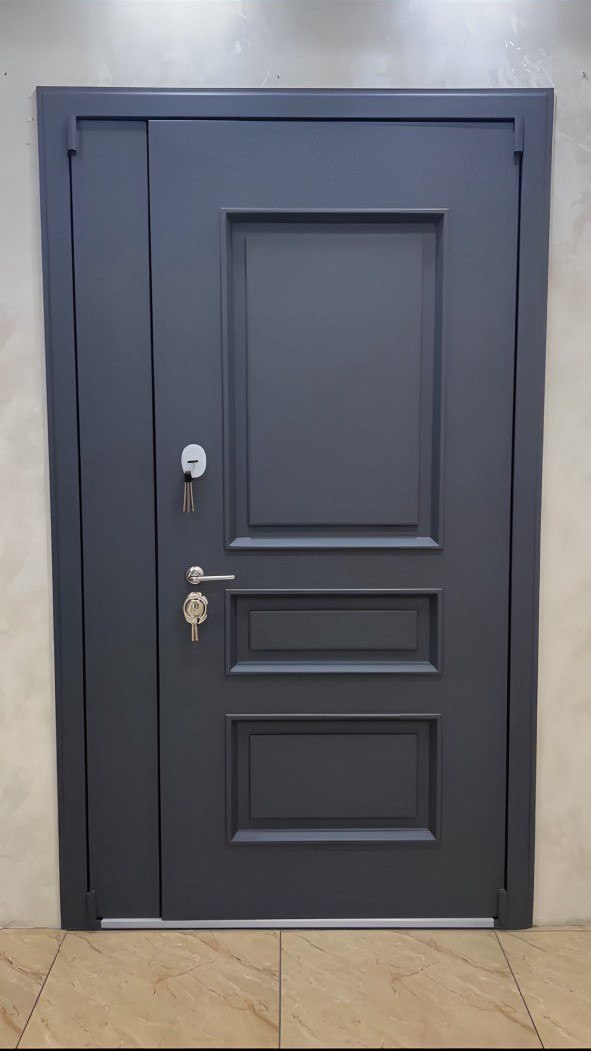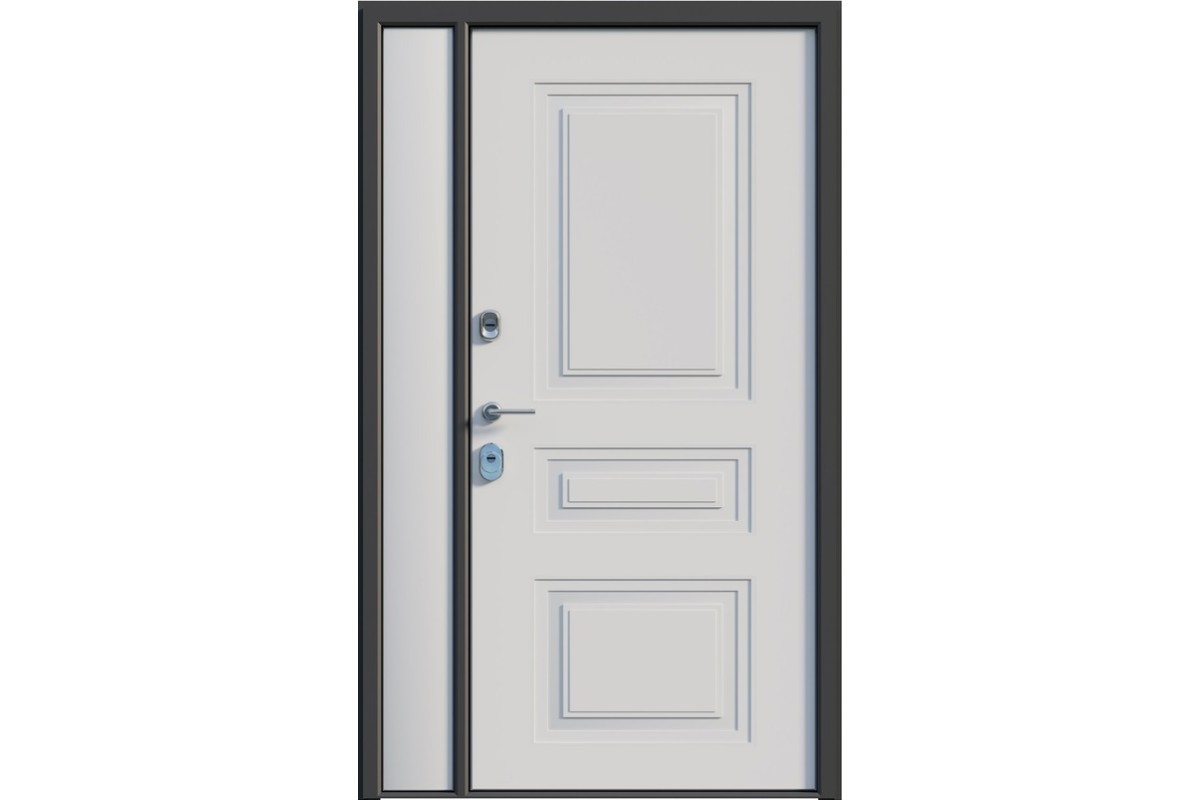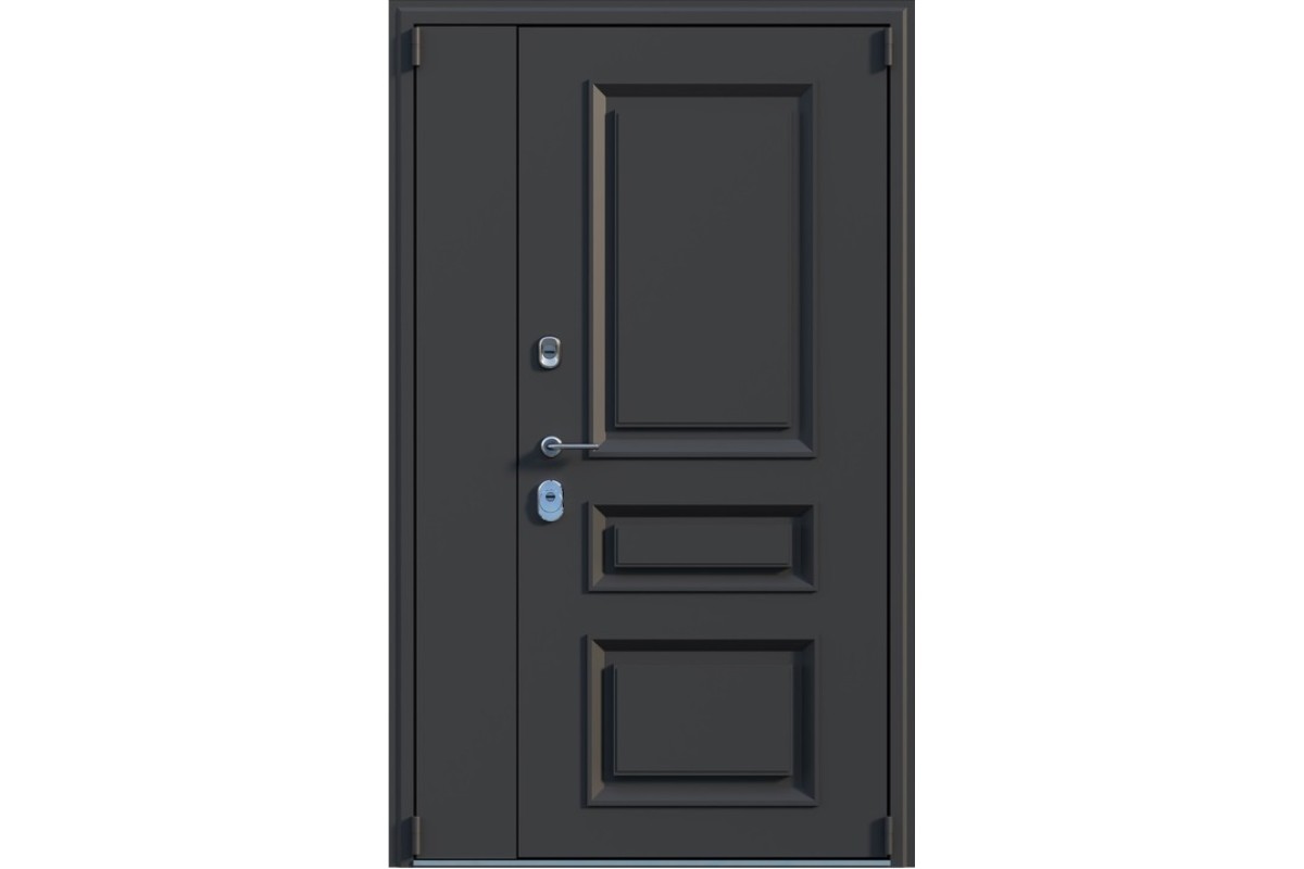 Толщина полотна: 100 мм Толщина короба: 115 мм Внешнее покрытие: Муар графит RAL 7024 , Цинкогрунт AkzoNobel Внутреннее покрытие: МДФ 16 мм, Белый Утеплитель: минеральная плита KNAUF Уплотнитель: 3 контура (2 Trelleborg, 1 магнитный) Петли: 4 шт, Барк, открывание 180° Замки: Цилиндровый и сувальдный Гардиан (4 класс взломостойкости) Противосъемные ригели: 3 шт, 12 мм Короб: закрытый, утепленный Наличник: фигурный, 80 мм Ручка: hаздельная, цвет - хром Порог: накладка из нержавеющей стали, хромированный Ночная задвижка: есть Эксцентрик: есть