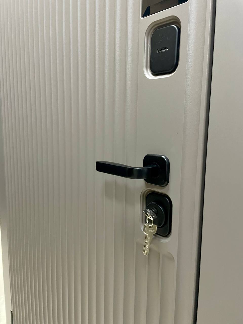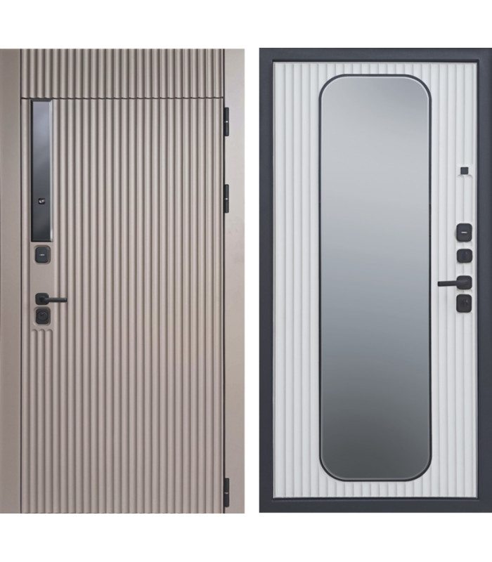 Отделка снаружи: панель МДФ 16мм, пленка гладкая матовая, цвет капучино. Вставка - стекло черное (для нанесения номера квартиры по желанию)