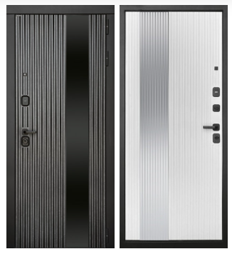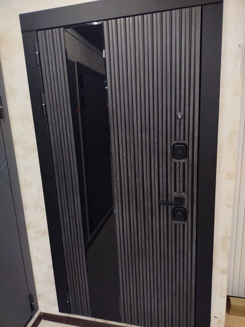 Отделка снаружи: панель МДФ 16 мм, пленка Верона графит, патина черная по фрезеровке. Вставка - стекло черное лакобель с фацетом. Наличники в пленке черная шагрень.