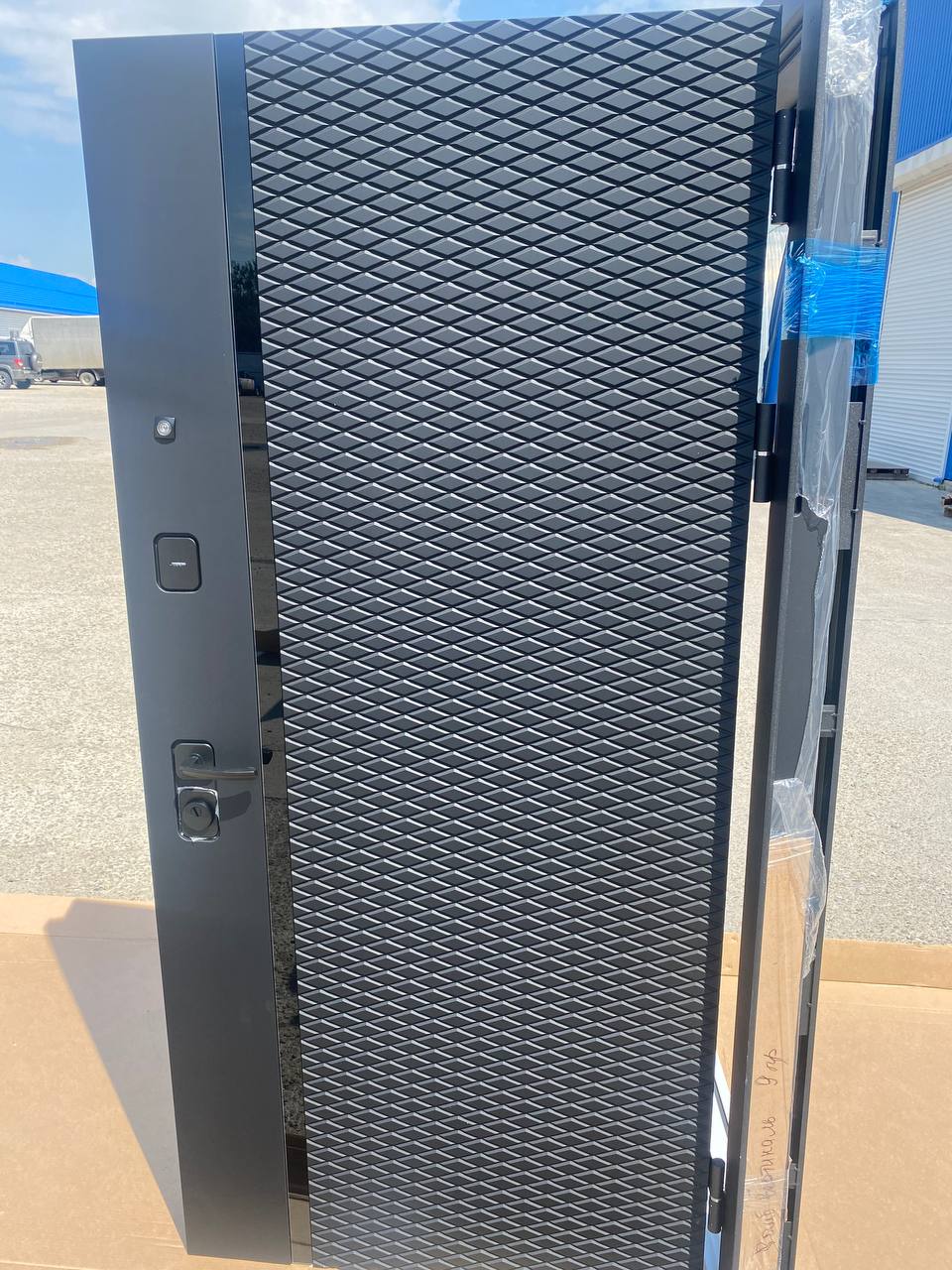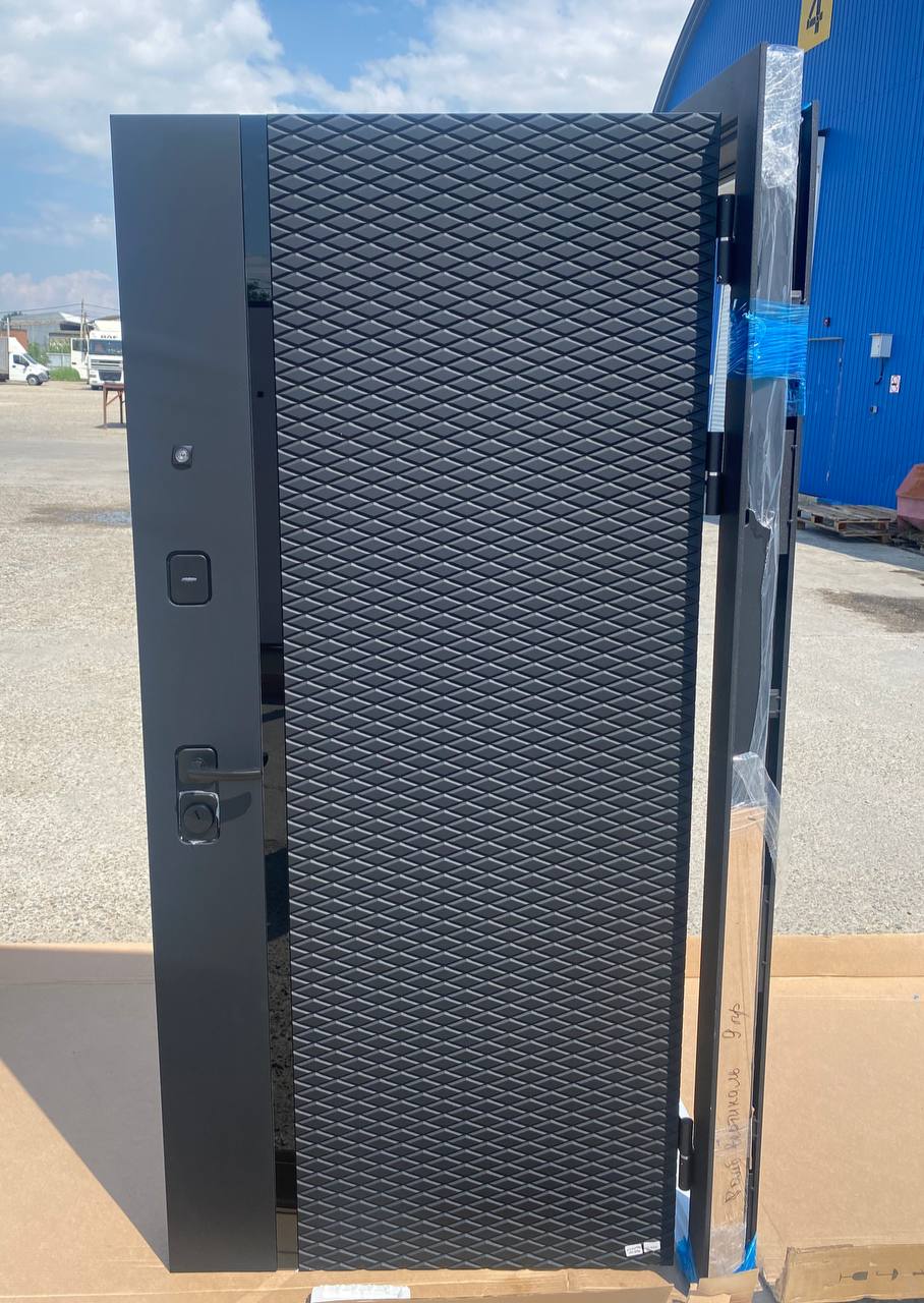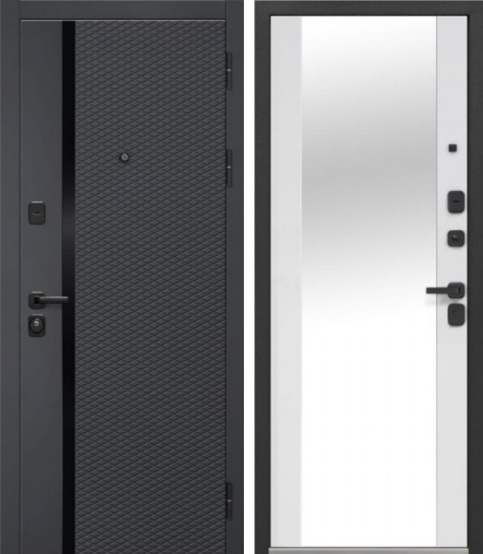 Внешнее покрытие: Фрезерованная МДФ-панель 12мм “Антрацит софт’’ Внутреннее покрытие: Фрезерованная МДФ-панель 10мм с зеркалом (цвет эмалит белый) Толщина дверного полотна: 120мм Толщина дверного короба: 128мм Толщина металла: 2мм Наполнитель: пенополистирол Уплотнитель: 3 контура уплотнения Замки: Основной замок- KALE-4 Цилиндровый. Дополнительный замок KALE-4 Сувальдный. Встроенная ночная задвижка Петли: 3шт с подшипником повышенной прочности, наружное открывание 180 градусов Противосъемные штыри 3шт Глазок: широкого обзора. хром Размеры: 860*2050мм, 960*2050мм Открывание: Правое, левое