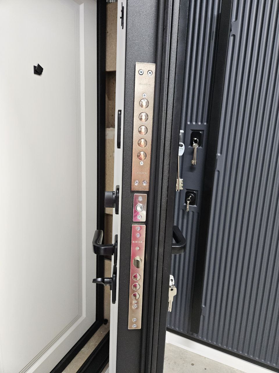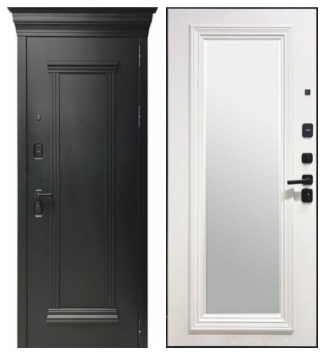 Входная дверь Александрия Отделка снаружи: МДФ 16мм, ПВХ Черный Кварц. ФЛ-Колонна Отделка внутри: МДФ 12 ММ, БАГА, ШИРОКИЙ БАГЕТ, ЗЕРКАЛО БЕЗ ГРАВИРОВКИ 1610х456(356) мм ZB 00 850-2 Белый Толщина полотна 90 мм. Дверь имеет закрытый утепленный короб, эксцентрик Наполнитель: Базальтовая плита Дверь имеет 3 контура уплотнения, 3 петли на опорных подшипниках обеспечивают мягкое открывание. На двери установлены замки Гардиан Г3011, Г3001 ВНИМАНИЕ! ВЕРХНИЙ НАЛИЧНИК ПРИОБРЕТАЕТСЯ ОТДЕЛЬНО - 1500р.