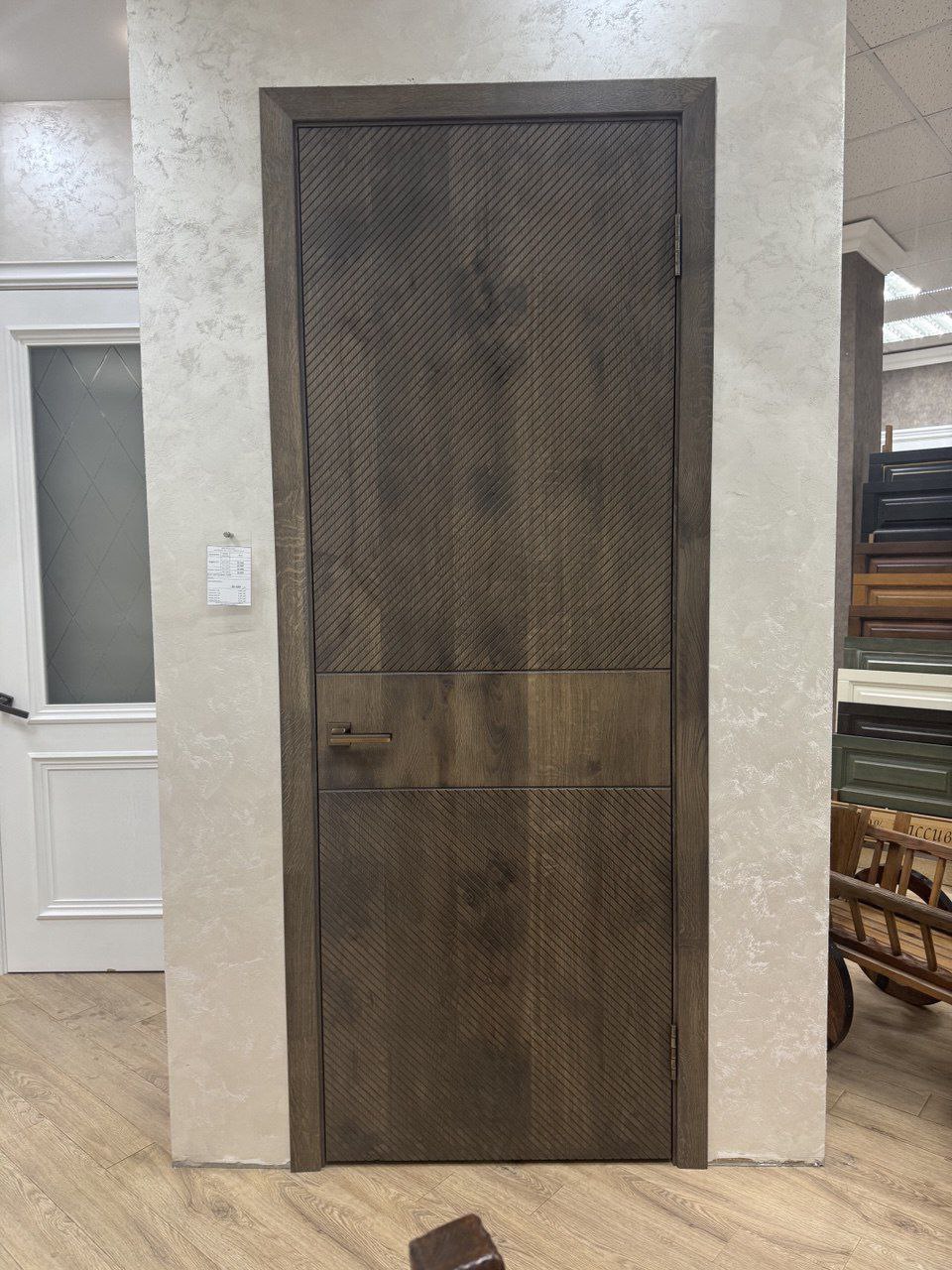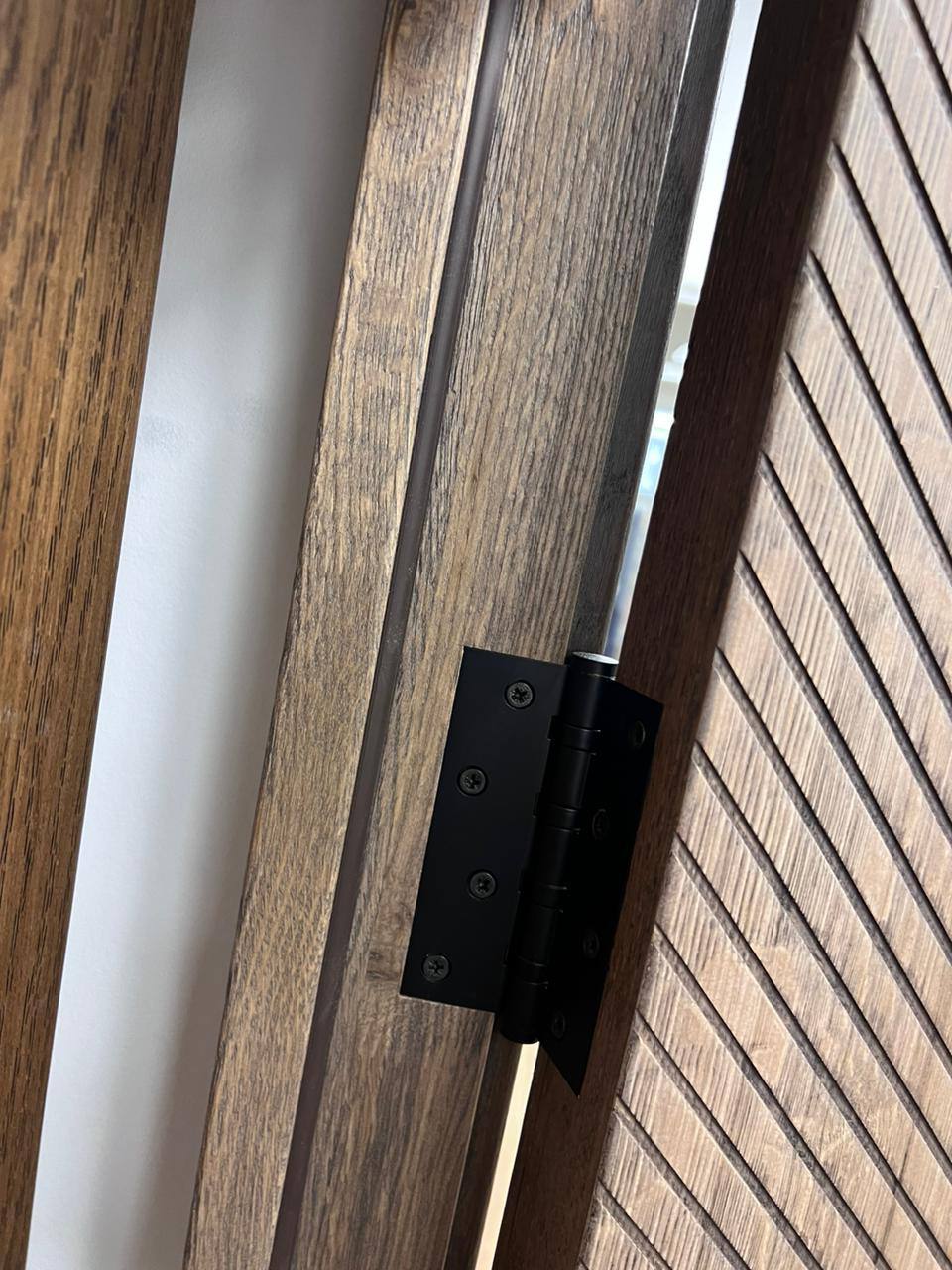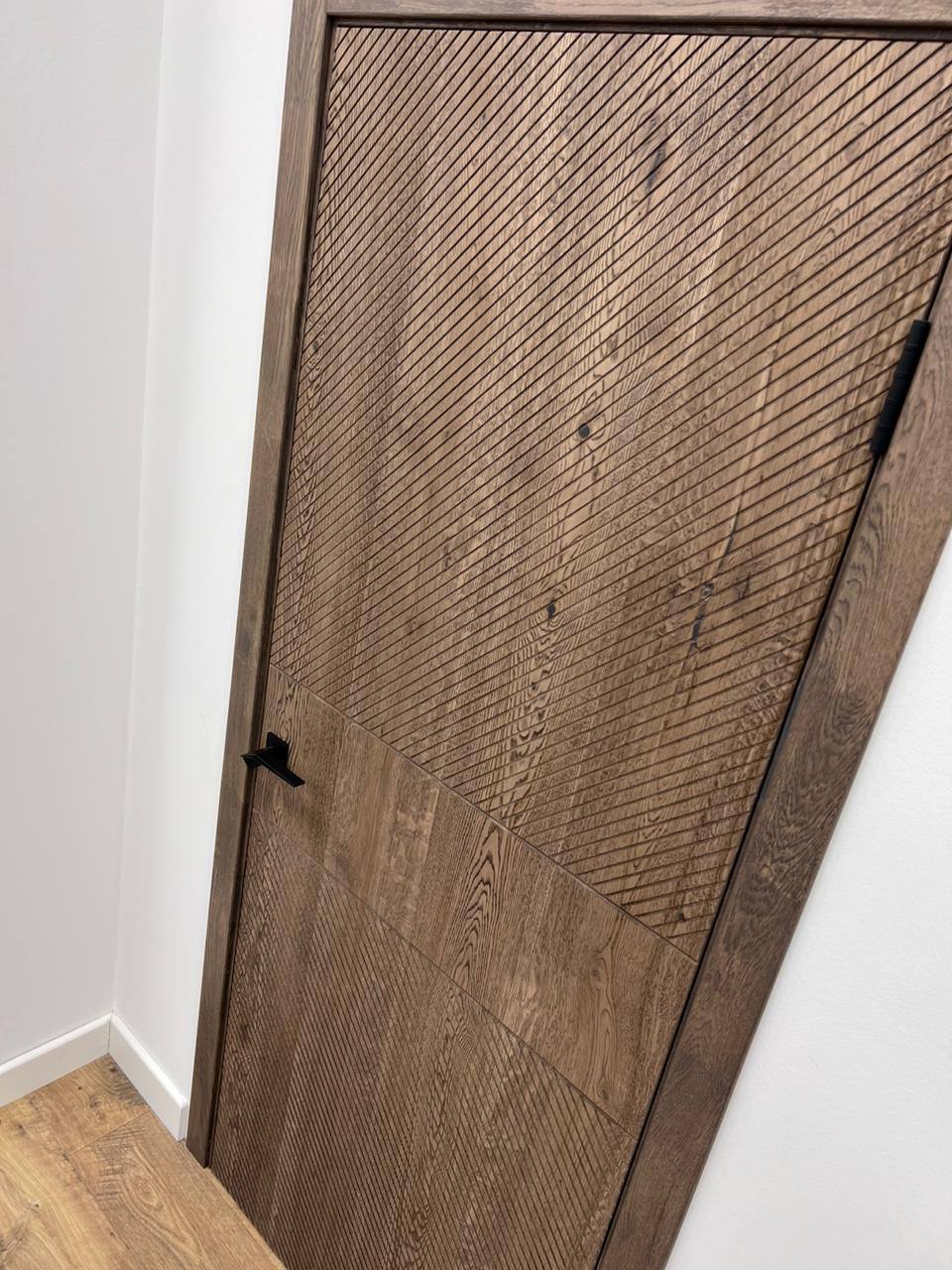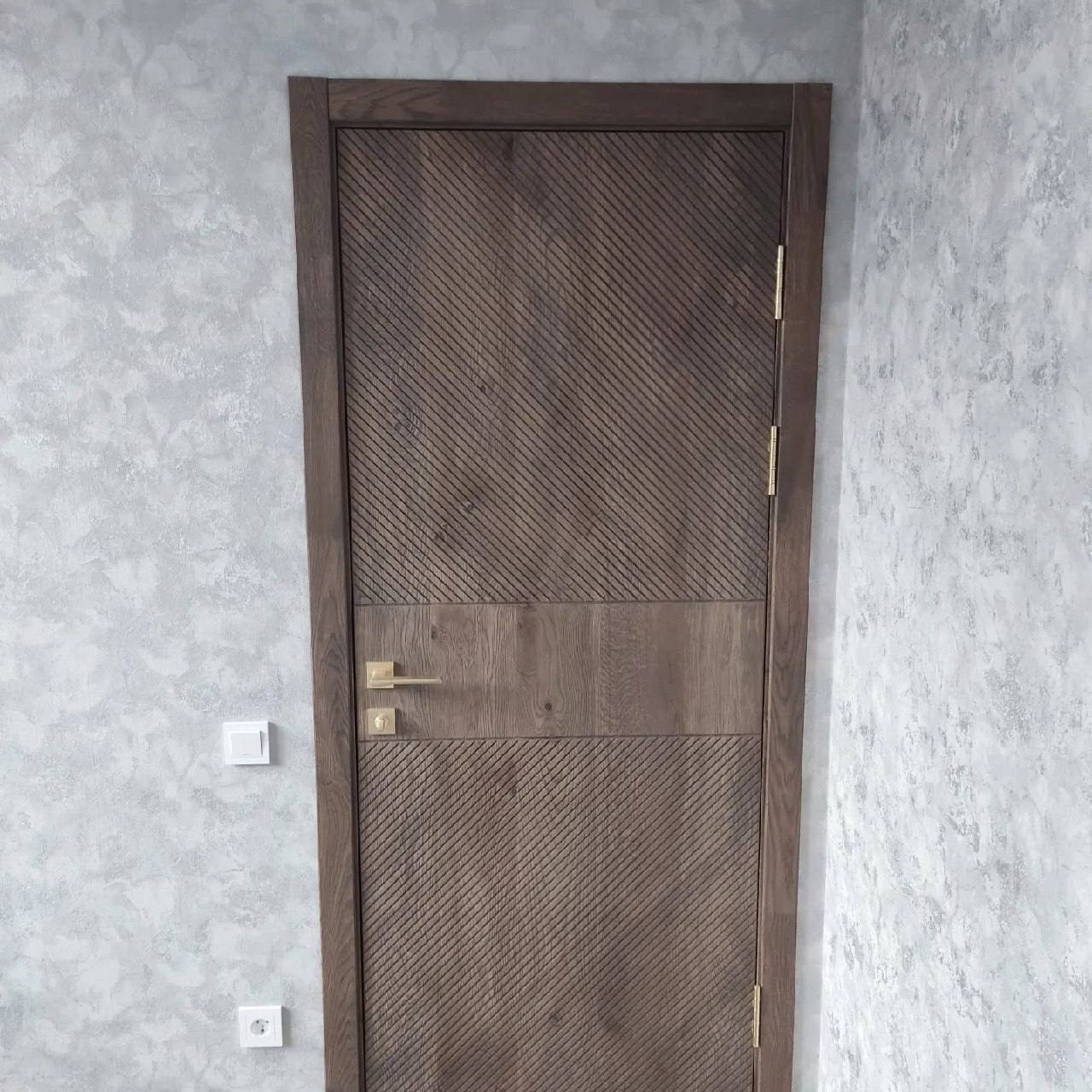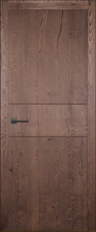 Межкомнатная дверь LEGNO 11 в темном цвете галифакс табак белорусской фабрики "Ока" в современном стиле. Полотно выполнено по технологии DSW, а каркас и внешние панели из 100% массива дуба, внутренняя часть двери — массив ольхи.